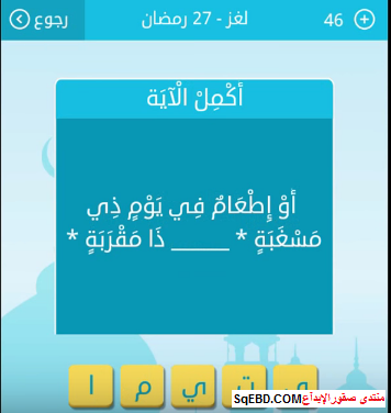 جواب لغز او اطعام في يوم ذي مسغبة ذا مقربة 27 رمضان من لعبة رشفة رمضانية صقور الإبدآع