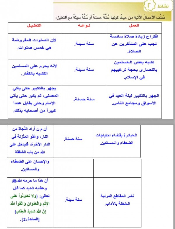 صنف الأعمال الأتية من حيث كونها سنة حسنة أو سنة سيئة مع التعليل معلومات وحلول الغاز
