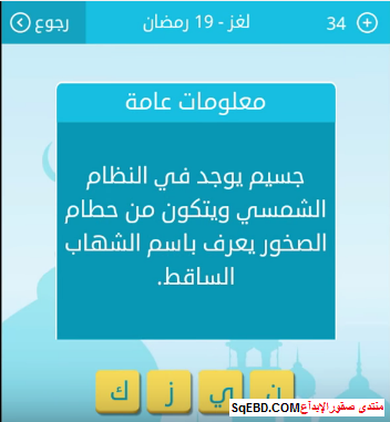 اجابة لغز جسيم يوجد في النظام الشمسي ويتكون من حطام الصخور يعرف باسم الشهاب الساقط من لغز 19 رمضان صقور الإبدآع