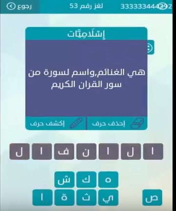اجابة هى الغنائم واسم لسورة من سور القرآن الكريم من لعبة وصلة فى المجموعة السادسة لغز رقم 53 صقور الإبدآع